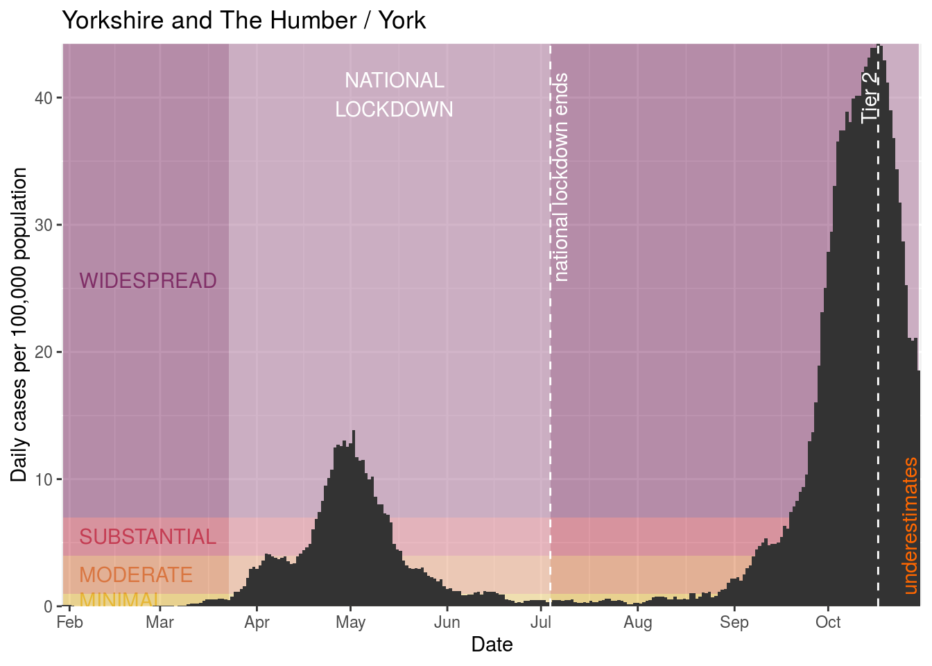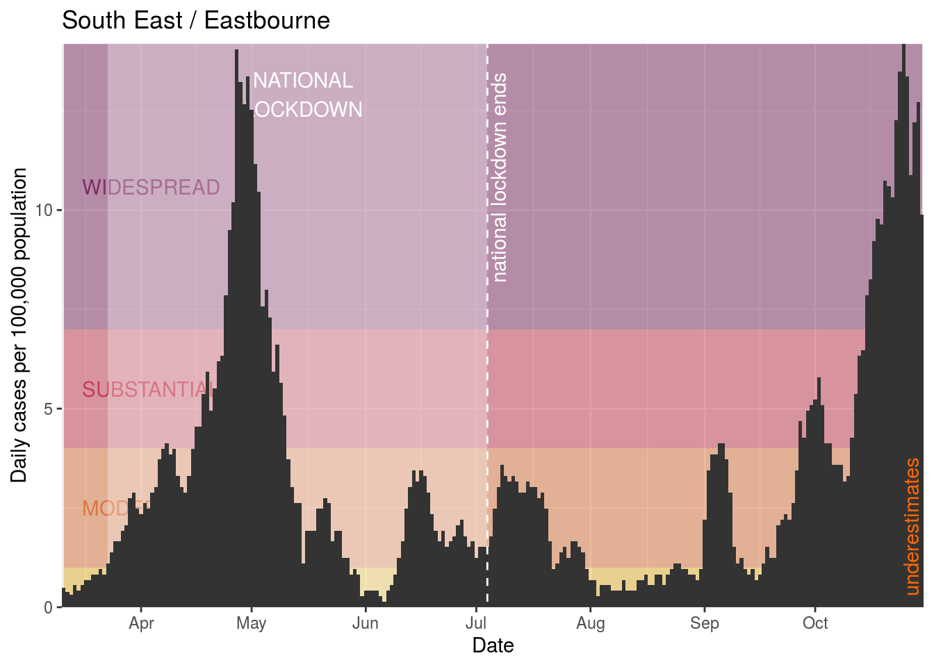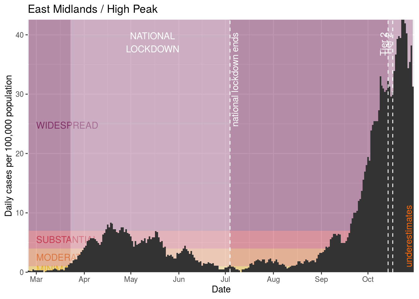 The graphs we’re creating here indicate underestimates due to the time it takes for new cases to filter through into reported data. Another thing that can cause an underestimate in the number of cases shown is the amount of testing that is going on and the degree to which people go and get testing (which they might not do for various reasons, such as if they think it will be unpleasant, time-consuming, or deprioritise their own testing in favour of others such as health and care workers). It would be good to be able to show where that’s likely to have been happening.