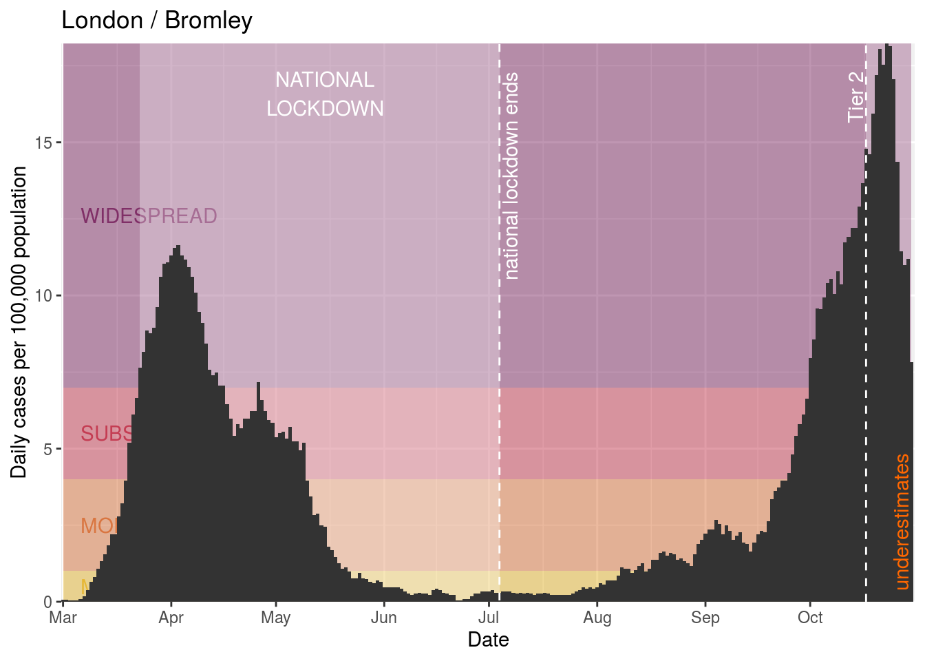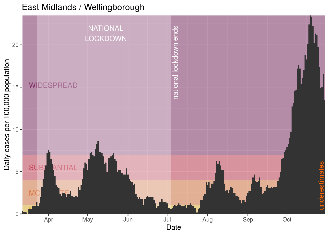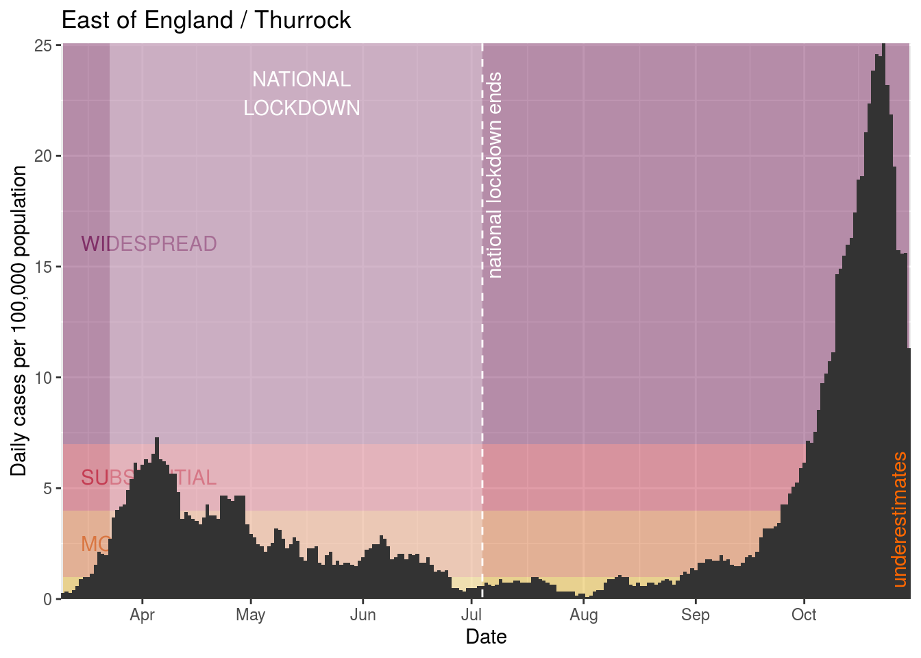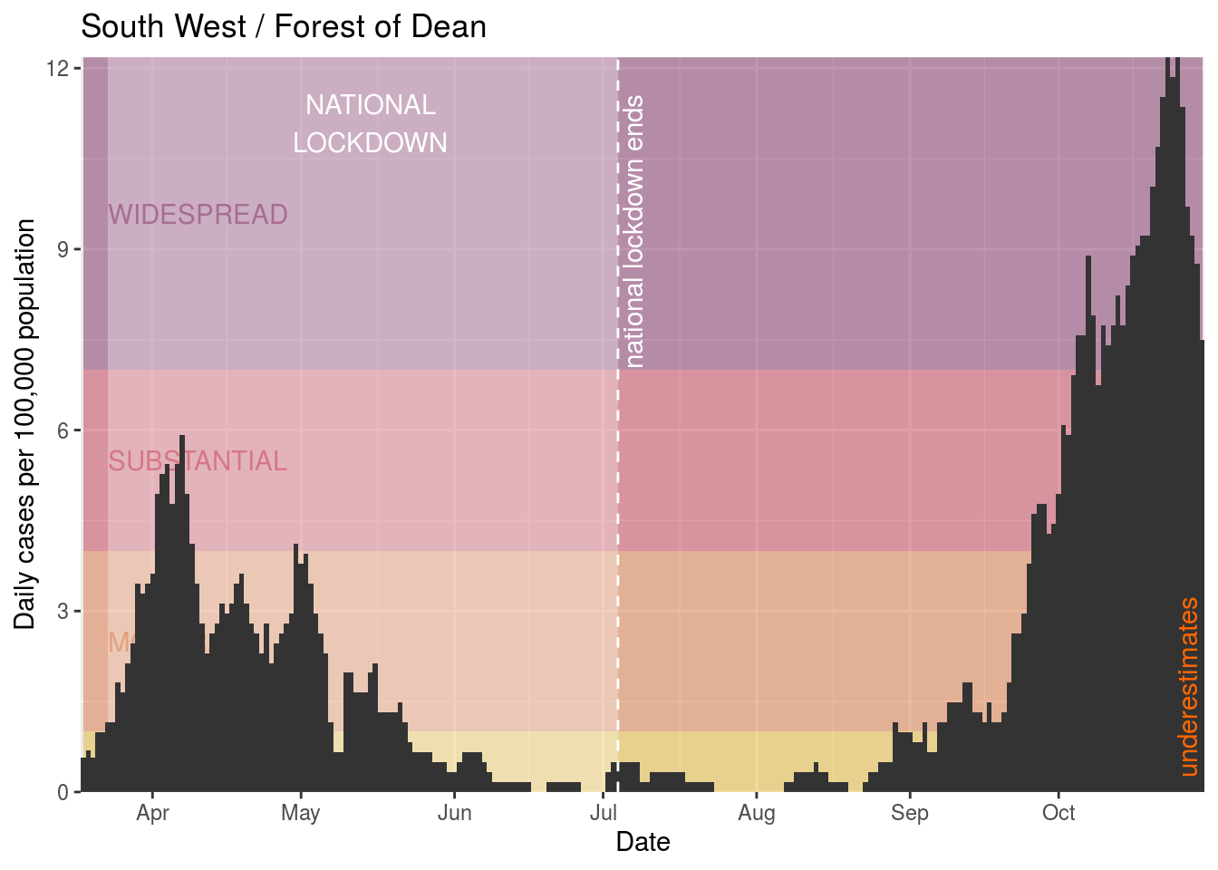 The graphs we’re creating here indicate underestimates due to the time it takes for new cases to filter through into reported data. Another thing that can cause an underestimate in the number of cases shown is the amount of testing that is going on and the degree to which people go and get testing (which they might not do for various reasons, such as if they think it will be unpleasant, time-consuming, or deprioritise their own testing in favour of others such as health and care workers). It would be good to be able to show where that’s likely to have been happening.