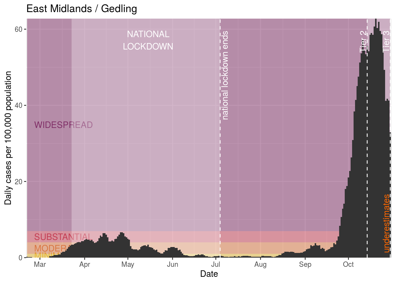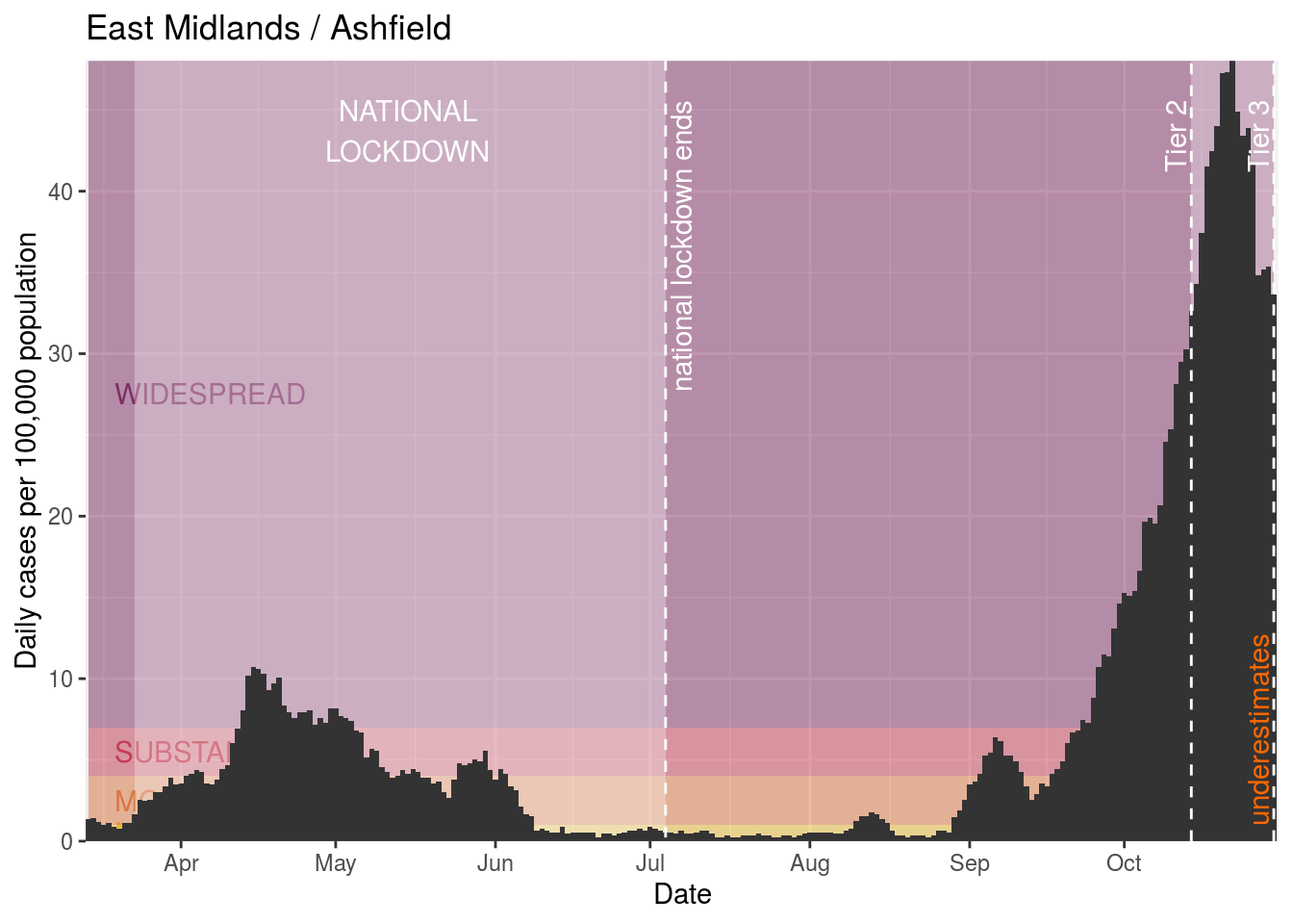 | East Midlands | E12000004 | Ashfield | E07000170 | 2020-10-30 | 0 | 2073 | 1620.6 |