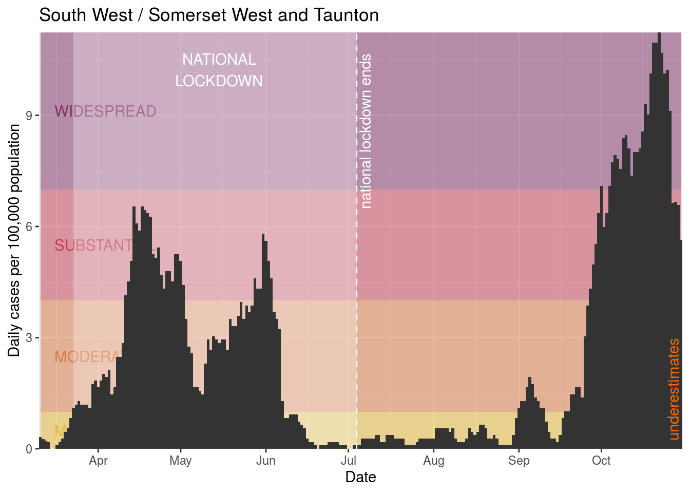 Now, when we plot the cases in a particular area, we can find any restrictions in that area and also plot those, alongside the nation-wide lockdown that ran from 23rd March to 4th July. Here I’ve shown that in blue.
