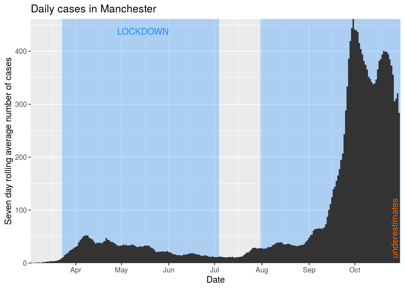 Here we can see that the national lockdown did have an effect in Manchester, but that the cases started rising again a couple of weeks before the local lockdown was put into effect. The local lockdown doesn’t seem to have had as big an effect on the number of cases.